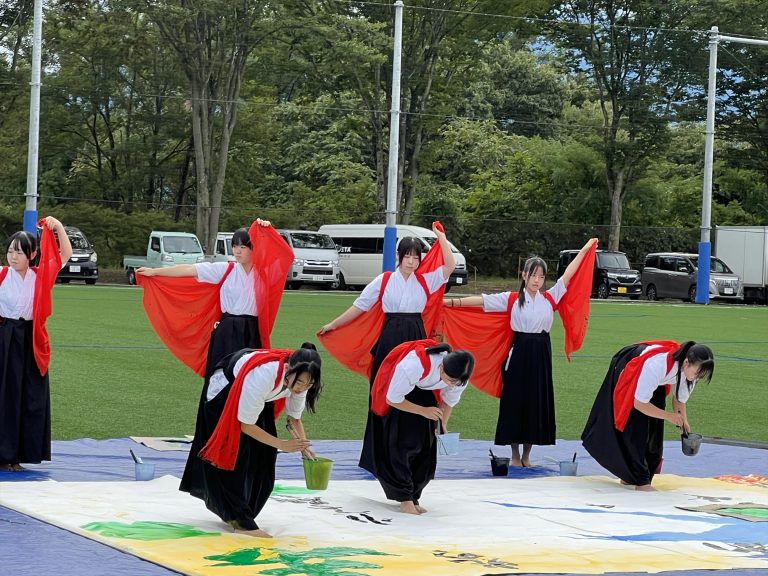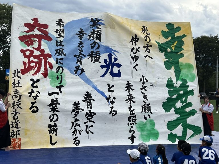 イベントでは、北杜高校書道部による「幸葉」をテーマとした力強い書道パフォーマンスが披露されました。「小さな願いは未来を照らす光となり、笑顔は幸せを育て、希望は芽吹き、奇跡の葉となる」という「幸葉」のメッセージを通じて、平和への祈りが表現されました。