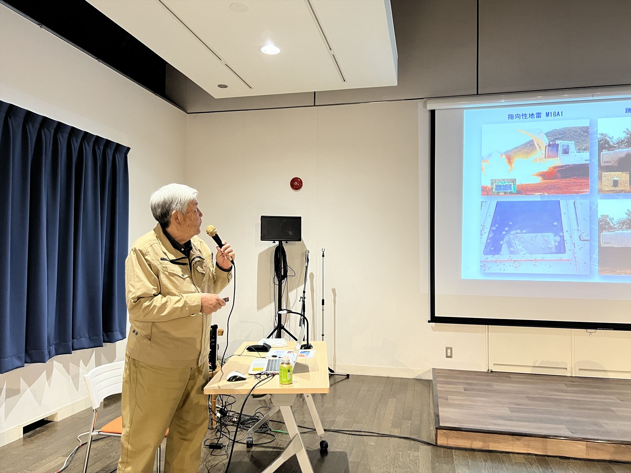 講演では、「モノづくりを通しての国際貢献」をテーマに、これまで国際協力の現場で経験してきた出来事や地雷被害に苦しむ人々の現状についてお話ししました。地雷が爆発する映像や被害を受けた人々の姿を通して、戦争や紛争が今なお世界のどこかで続いている現実、そして平和が決して当たり前ではないことを、生徒たちは真剣な表情で受け止めていました。