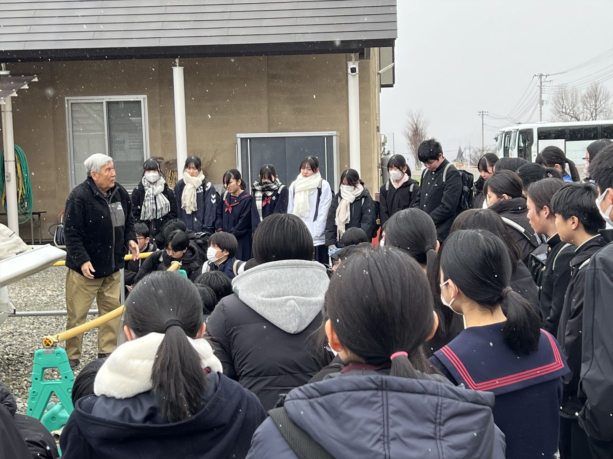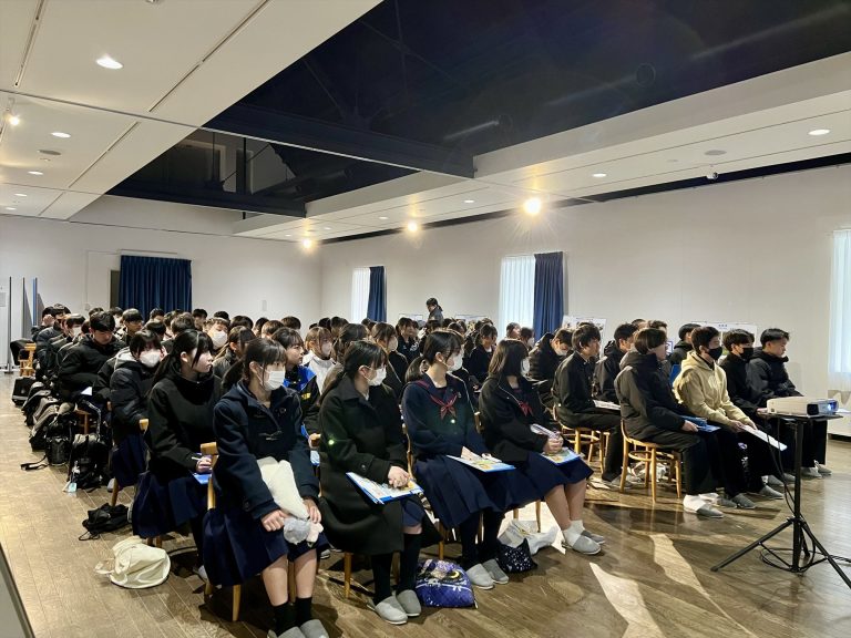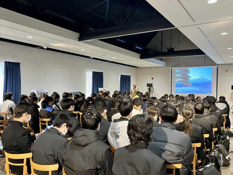 1月13日(月)、北杜市いこいの杜コミュニティーパークにて、北杜市立高根中学校3年生85名を対象に平和学習の一環として体験講演会を実施しました。